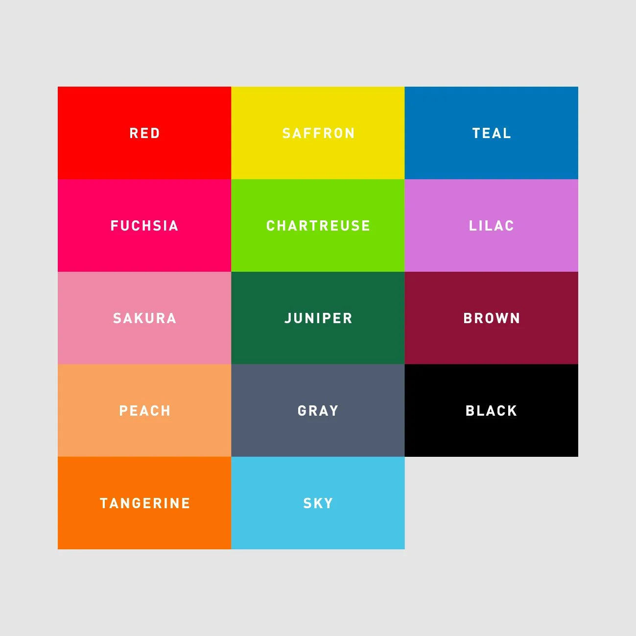 Red Fuchsia Sakura Peach Tangerine Saffron Chartreuse Juniper Gray Sky Teal Lilac Brown Black