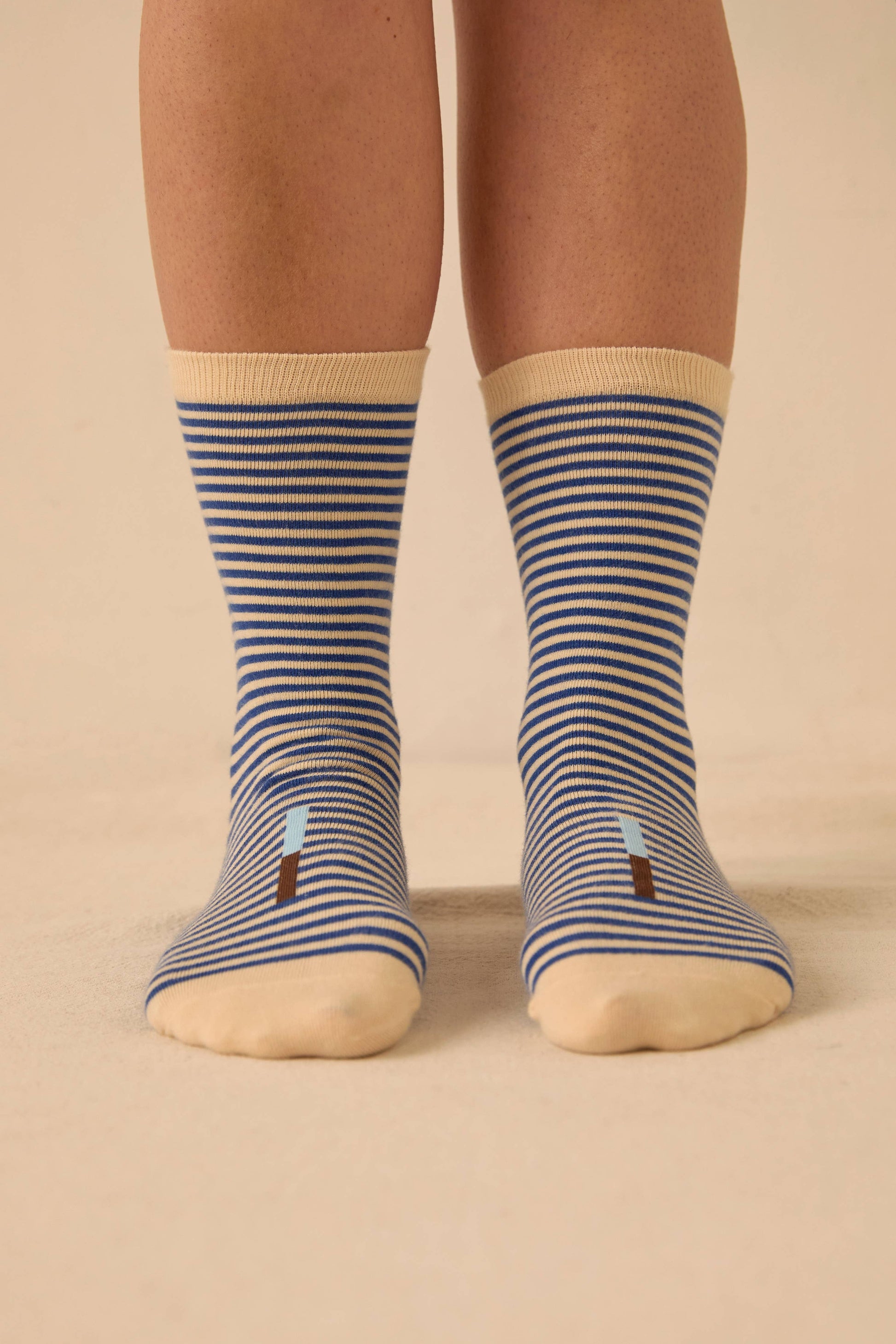 Lightweight, comfy blue crew socks with classic off-white stripes. 65% cotton, 35% spandex • fits women’s size 4 - 10