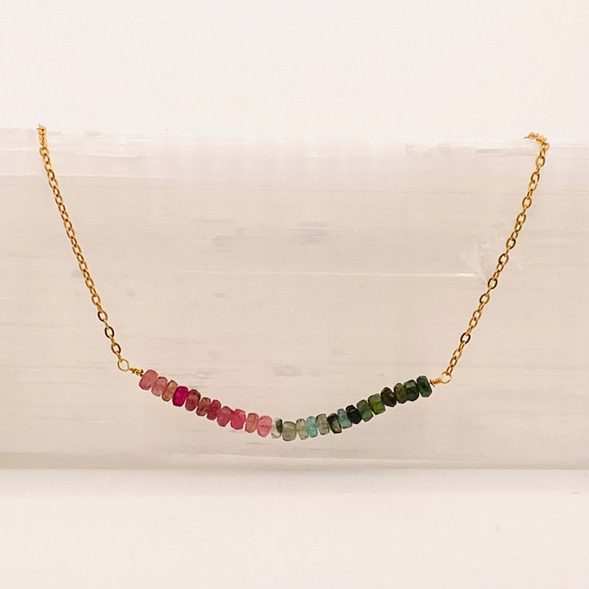 The most gorgeous blend of bright happy color on a 2 inch gold filled bar attached to gold filled chain and clasp to be worn at adjustable lengths 14-18 inches